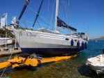 Nos voisins du Loftboat40 nous précédent, on observe attentivement les manœuvres. On repositionne les pare-battages. Une heure plus tard, c’est au tour d’Opale d’être lancé. La remorque à glissière Roodberg SWL 38MT, en forme de U et son cadre de portage soulève la coque du bateau et l’ensemble roule jusqu’à la pente de mise à l’eau. On le suit à pied et on admire le calme et le professionnalisme de l’équipe , du petit fils, monté à bord qui manipule les amarres au superviseur Nikos, en passant par Kalliopi, la général manager, discrète et efficace et Vivi, souriante francophone et pleine de bonne volonté. Du conducteur de la remorque au mécanicien, nous n’avons qu’à louer la qualité exemplaire de service du personnel compétent et sympathique d’Artemis Leros Boatyard, http://lerosboatyardltd.com .