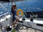 On lève l’ancre, Patrick à la barre, Fabienne à la baille à mouillage remonte l’ancre. Fabienne prend la barre pour se mettre face au vent, Patrick hisse la GV au winch puis file au pied de mât.