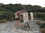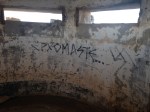 Avec la reprise alimentaire, la tension de Fabienne remonte, presque 9/6, elle en profite après sa demi-heure de nage quotidienne pour marcher jusqu’à la tour, en haut de la colline. En fait, la tour se révèle être un mirador bâti sur un blockhaus, par l’occupant allemand durant la Seconde Guerre Mondiale. Léros passa de l’occupation ottomane qui durait depuis 400 ans à l’occupation italienne, comme le reste du Dodécanèse, en 1912, à la suite de la guerre italo-turque. En 1943, les Allemands tentèrent de reprendre l’île aux Italiens, suite à leur reddition, devenus alliés des Britanniques et des Grecs, Elle fut très durement bombardée pendant plus d’un mois et demi, puis tomba finalement aux mains de l’ennemi. C’est cette offensive qui a inspiré la bataille de Kéros dans le film « Les canons de Navarone ». Après la guerre, Leros comme le reste du Dodécanèse, fut finalement rattachée à la Grèce en 1948. L’importance stratégique de la colline surplombant la baie de Blefoutis et sa vue sur les côtes turques explique la position de ce mirador et un peu plus bas d’une caserne qui sert à présent d’abri pour les chèvres. En redescendant, Fabienne découvre, caché par des arbustes, un porte mitrailleuse, rouillé et scellé au sol, visant un éventuel débarquement; marque du temps sur une petite plage devenue paradisiaque.